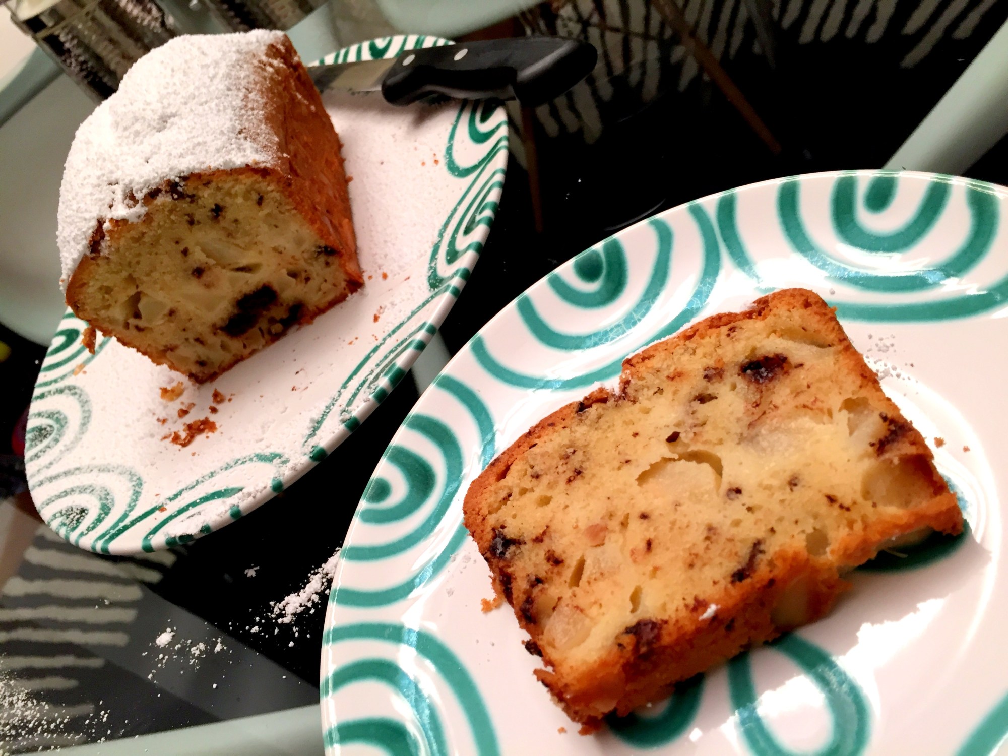 Few things are as complimentary to your morning or afternoon tea as a nice piece of sponge cake. Cyrus claims that sponge cake remains to be his favorite type of cake, and although I like it, too, I find it can be a bit dry and boring at times. So I experimented a bit with different variations of sponge cake and came up with this recipe. The pear and chocolate give it a nice moist texture and a direction of taste that may not be highly innovative in itself, but is a nice change to the very classic lemon, chocolate chip or marble sponge cakes.