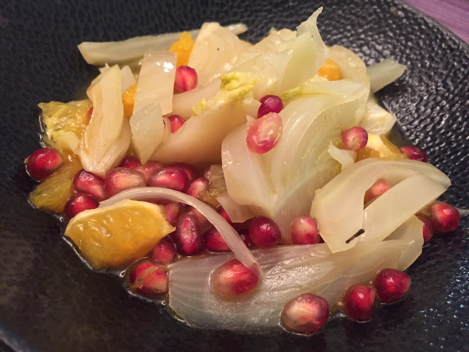 - Place the fennel and dressing into an appropriate salad bowl, mix in the orange fillets and sprinkle the pomegranate over it.