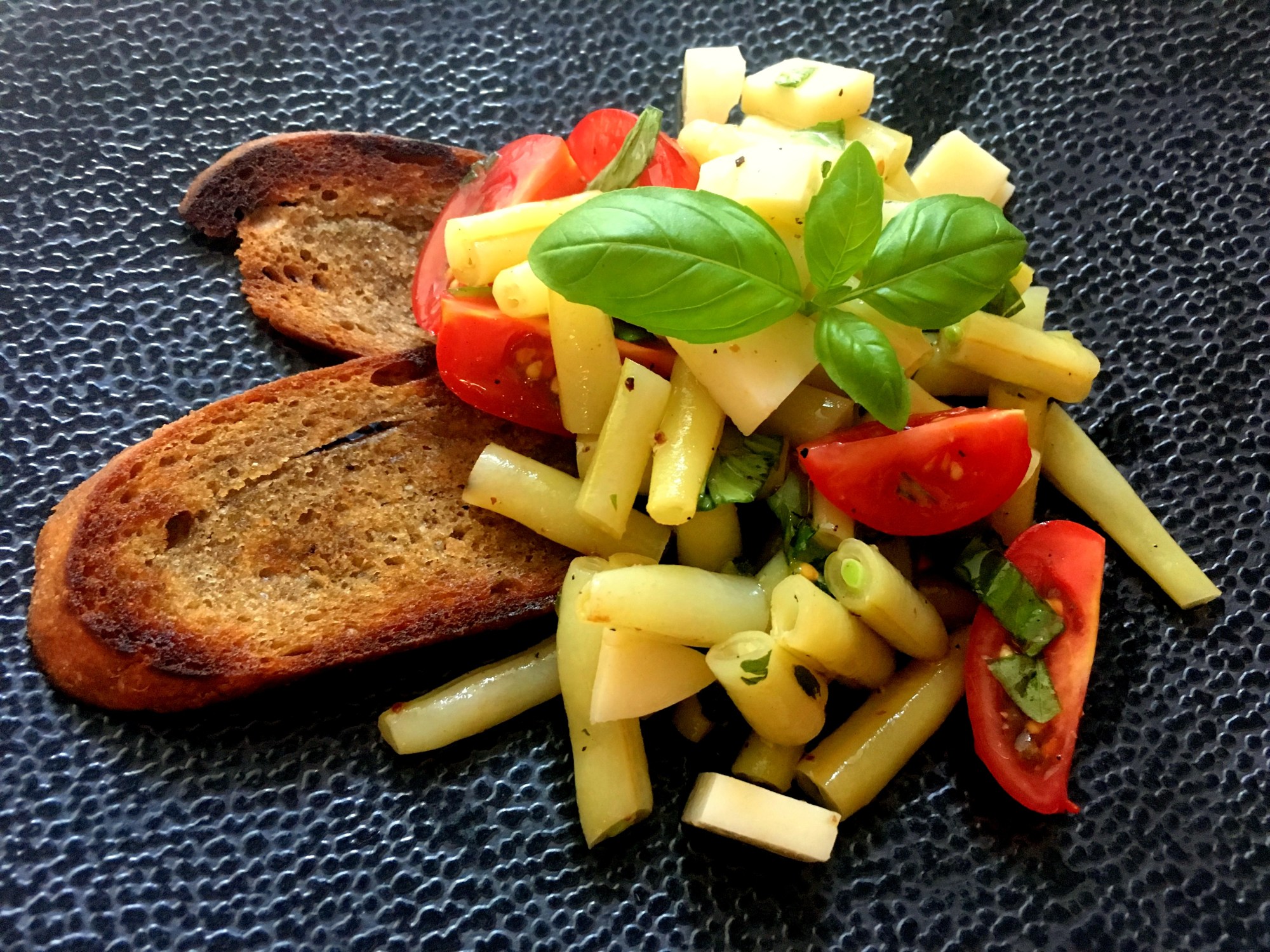 Wax beans are such a lovely vegetable which are a wonderful ingredient in a large variety of summer salads, but their season is, unfortunately, a short one. One better makes the most of it! This recipe is with grape tomatoes, fresh basil and (fresh, i.e. non-smoked) Scamorza cheese. The dish may be enjoyed either as a tapas-style starter, or it also makes a very nice side to a hearty slab of good meat from the barbecue.