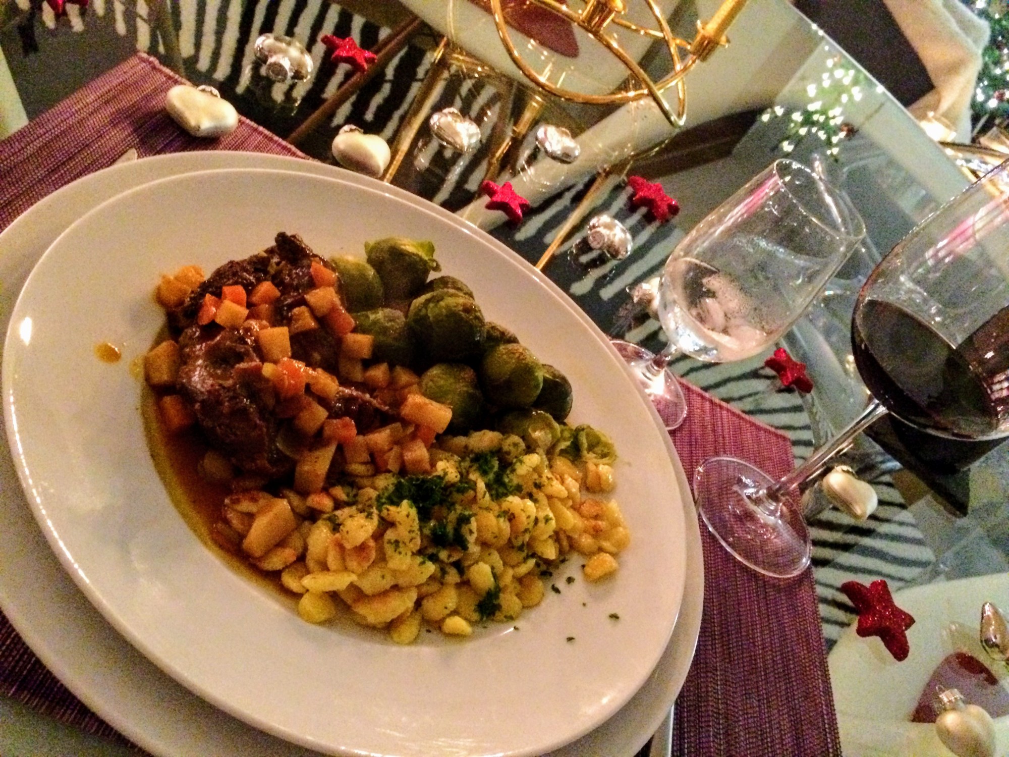 I did take a short-cut with the spaetzle and bought a packet of fresh pre-made spaetzle from the supermarket. So here is an idea for next Christmas… 😉