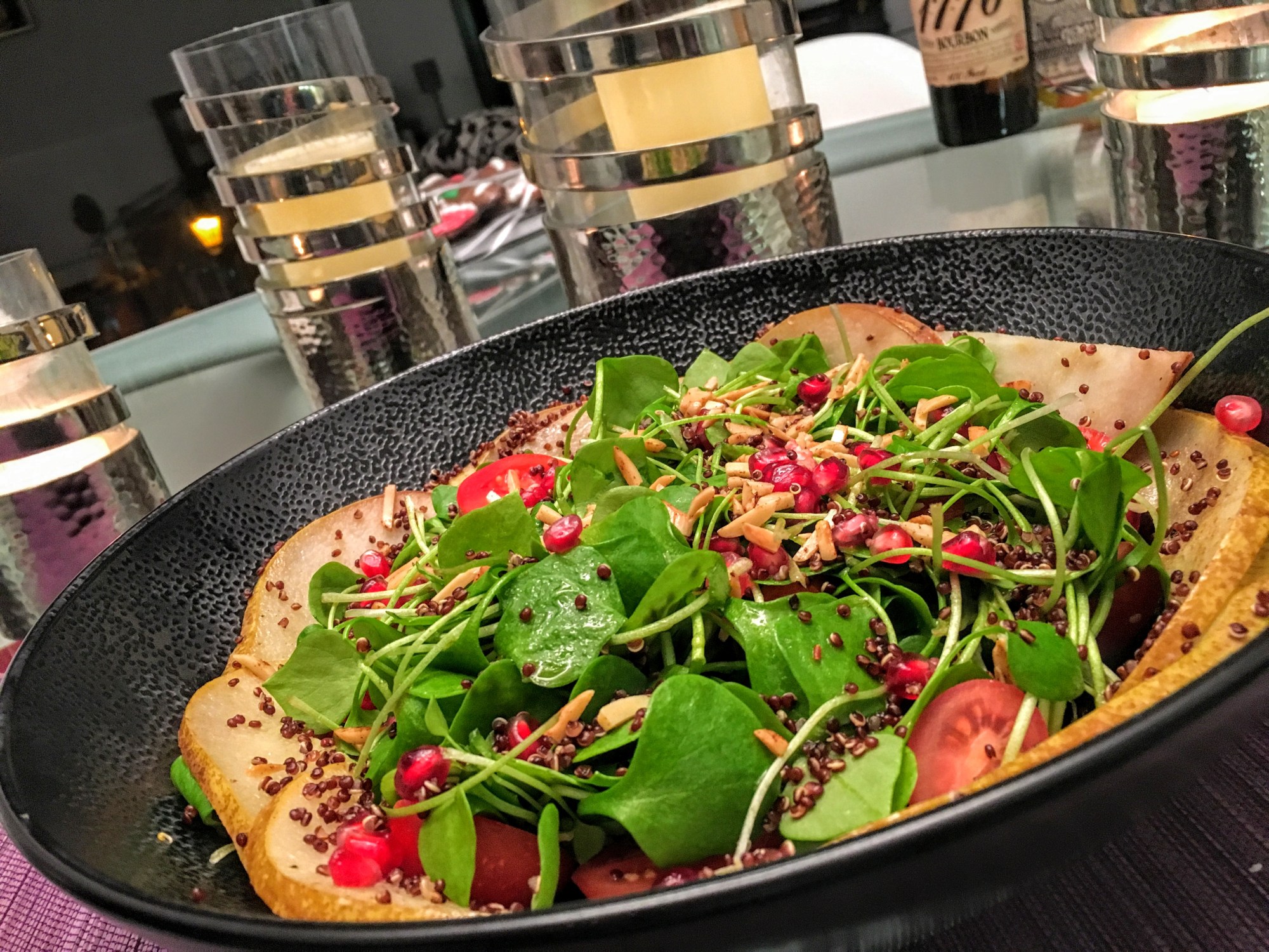 Winter purslane is a wonderfully soft-leaved lettuce with a rather unobstrusive taste so I think it requires a bit of a side-kick, although it should not be too dominant. The job is done by the browned pear and roasted quinoa and almond slivers here.