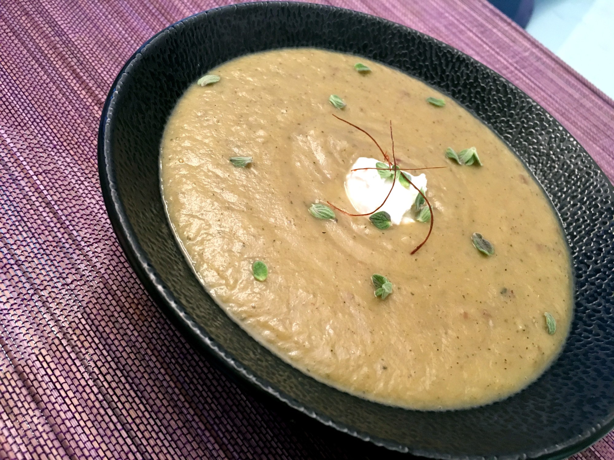 This is a quick and lean soup. For the potato, I used a blue variety with a shorter cooking time (Blauer Schwede aka Blue Congo), which also has a very intense flavour, but other varieties will certainly work as well (especially for waxy varieties, increase the cooking time, though). Leek and oregano combine into a flavorful warming winter soup.
