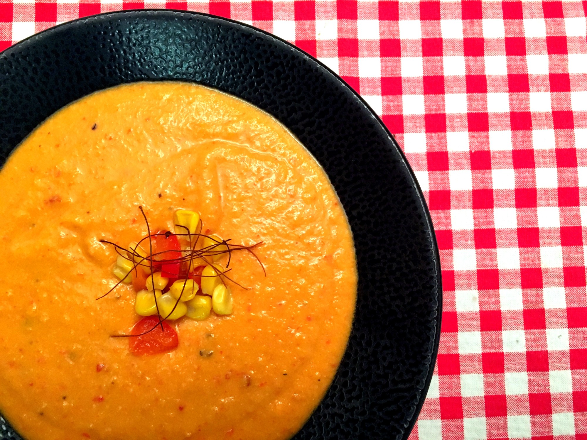 Sweetcorn and red pepper are the main ingredients of this creamy and full-flavored dish with mild chile ancho complementing the taste. Poblano would be non-dried alternative to the ancho chile but it is a bit hard to come buy outside of North America.