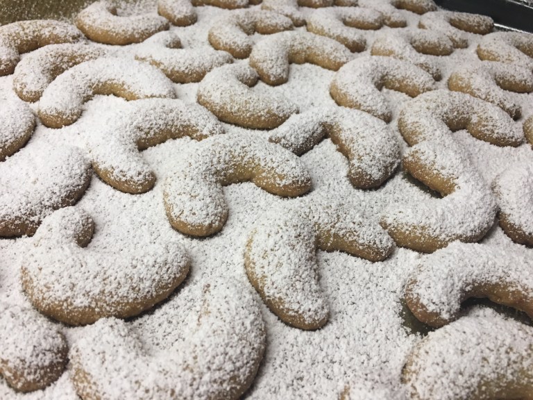 The crescent-shaped biscuits with vanilla flavoring are traditionally made around Christmas in a number of Central European countries such as Germany, Austria, Poland, the Czech Republic and Hungary. They are fairly easy to make, only remember to keep the dough well cooled – this makes it easier to handle and also prevents the dough from spreading wide during baking. Consume fresh (usually not a problem, see above 😉 ).