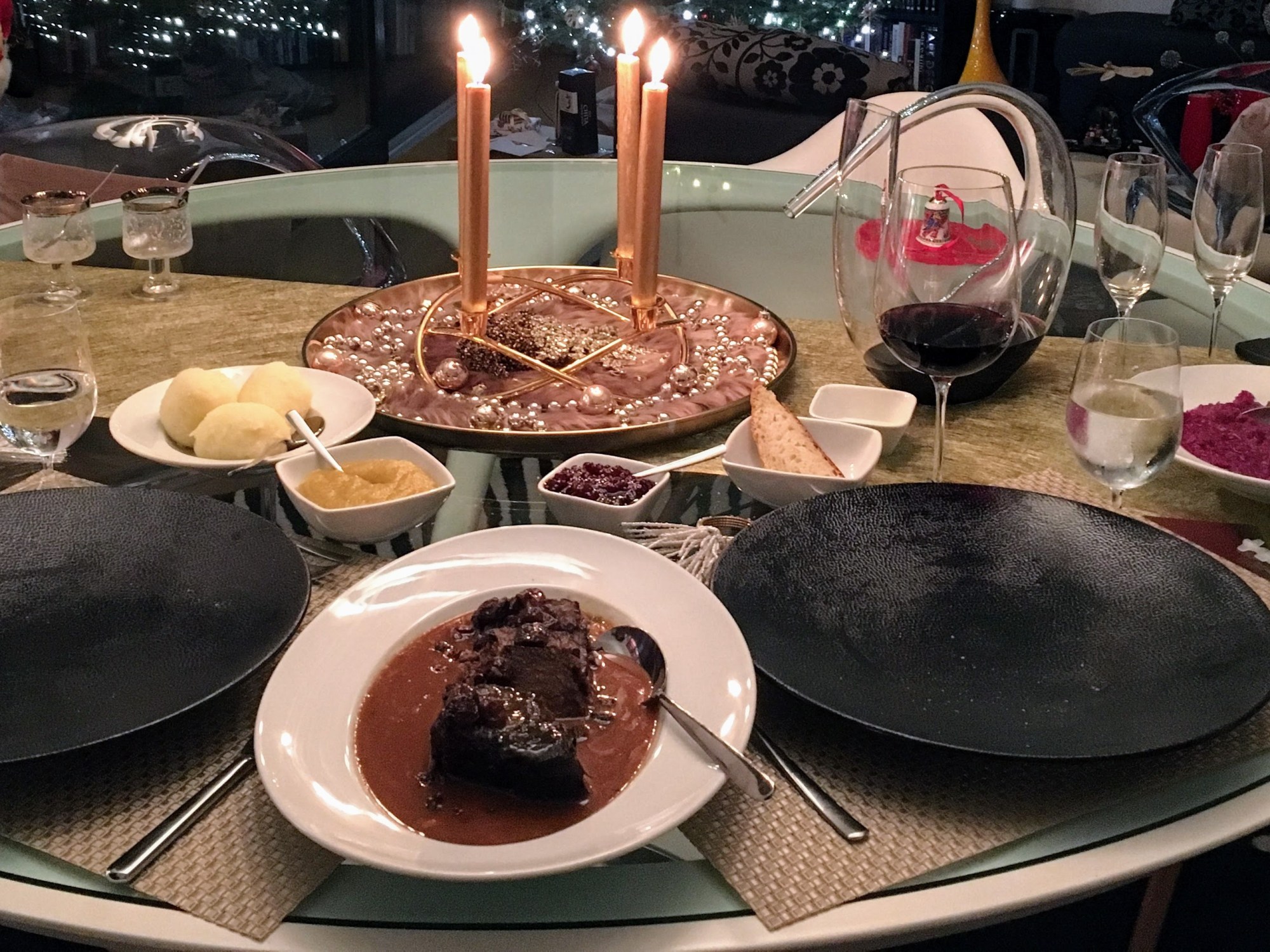 I only started growing really fond of it when Cyrus and me – somewhat accidentally – ended up in a traditional Rhenish Brauhaus (brewery) one evening shortly after he had relocated to Germany, and Cyrus immediately fell in love with sauerbraten which he had dared tackle despite my many disclaimers. So sauerbraten made a re-entry into my live and a strong one as, through Cyrus, it even got accepted onto the exclusive shortlist known as Christmas dinner repertoire (and, as you can see from the pictures, ending up winner in one year)! So during the further 10 years we continued living in the Rhineland and beyond, I believe I just decided at one point that it would be easiest for me to better start loving sauerbraten, too. And, in fact, I truly do today.