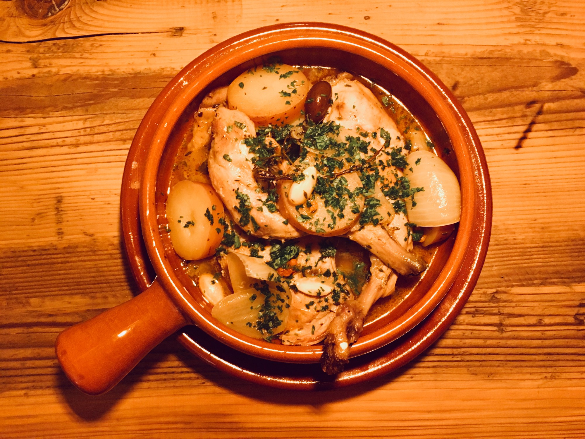 - Deglaze with the white wine and the chicken stock. Bring to the boil, then fill the rabbit and almonds and the vegetable, herb and spice mix into a large roaster (briefly pre-warmed in the oven) and cover with a lid.