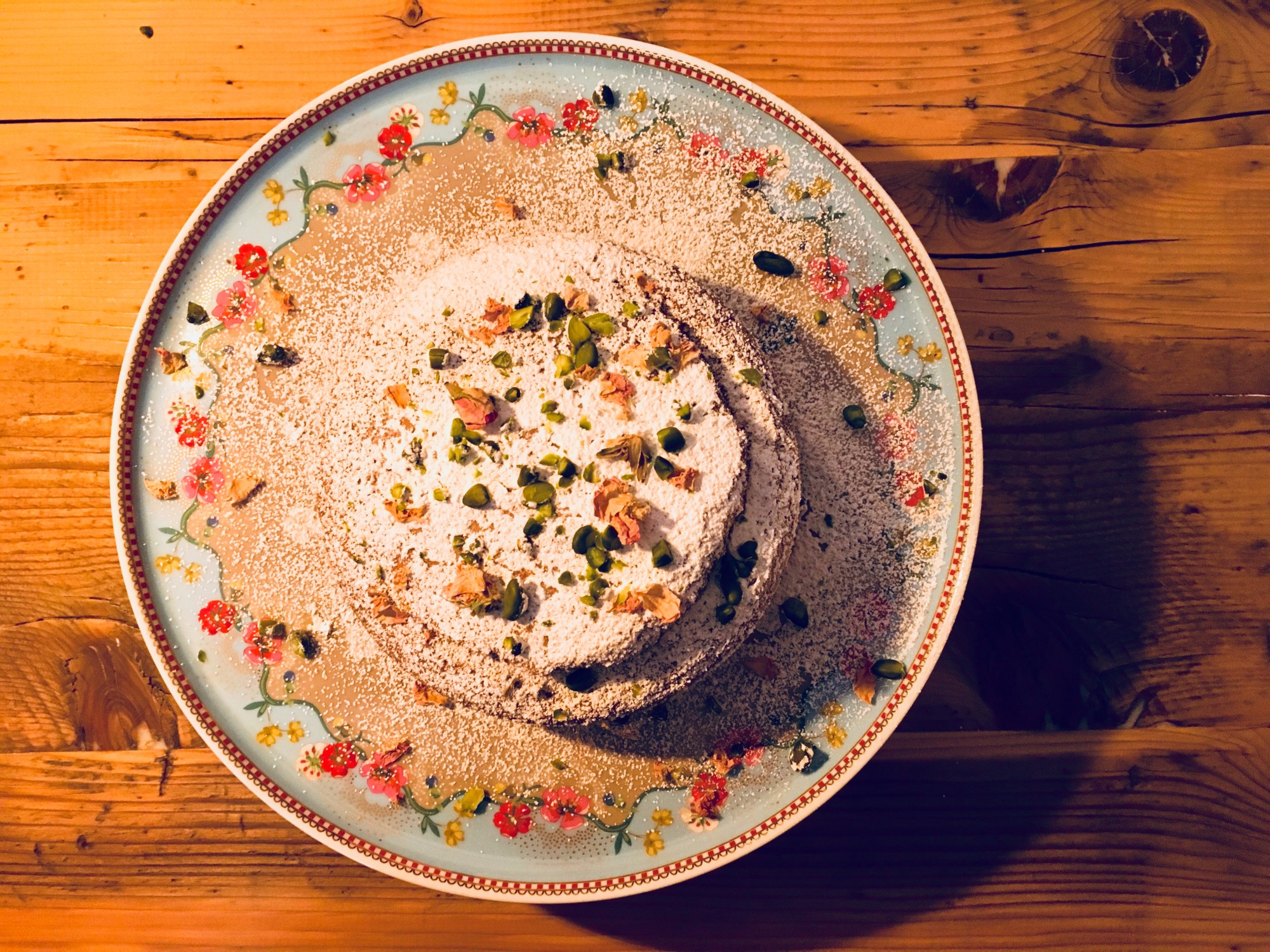 - For decoration mix the icing sugar with the cardamon powder. Roughly chop the pistachios. Dust the cake with the sugar and cardamon mix and sprinkle the chopped pistachios and rose petals over the cake.