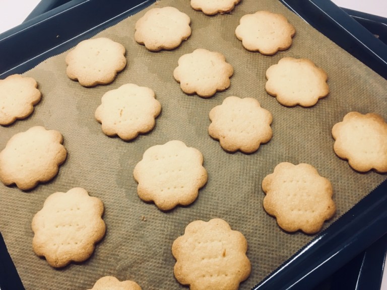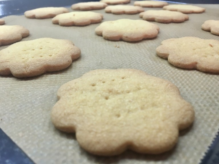 - Line two baking trays with parchment paper. Roll out the dough ca. 0.5 cm thick. Use a round crinkle edge cutter to cut out the biscuits (the shape of the pastry cutter I used is actually not quite right but it is somewhat close enough). Place them on the baking trays.