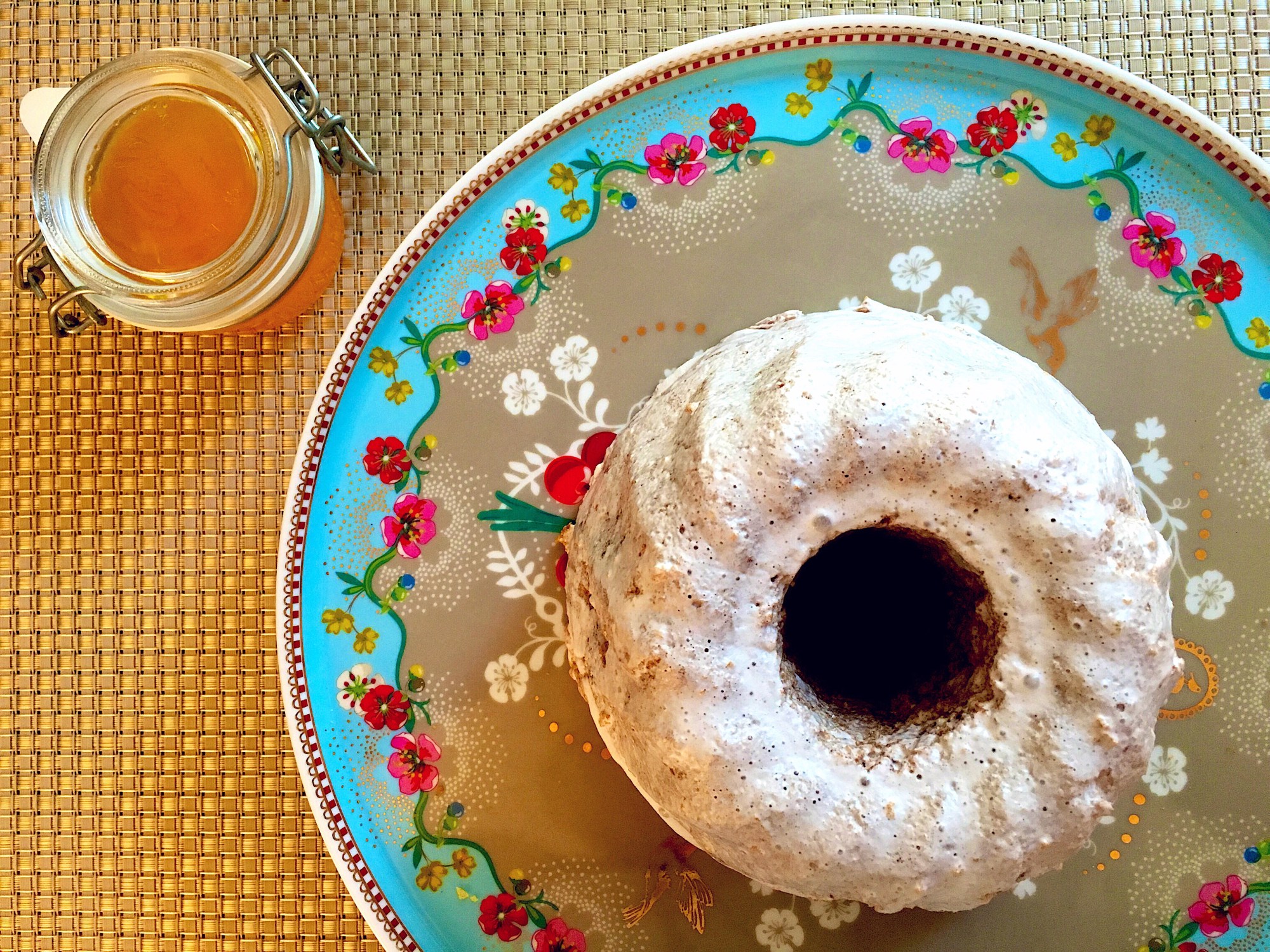 - Optionally, decorate with icing. Beat the egg white for a few seconds until foamy, then gradually, add the sugar. Add orange blossom water (careful: do not add too much or the icing becomes too thin). Place the cake on a grate over a sheet of aluminium foil and slowly pour the icing over the cake. You can re-use the icing that you catch on the aluminium foil and repeat the previous step several times until the cake is fully covered with icing and nearly no icing drips off any more. Let air-dry for several hours before serving.