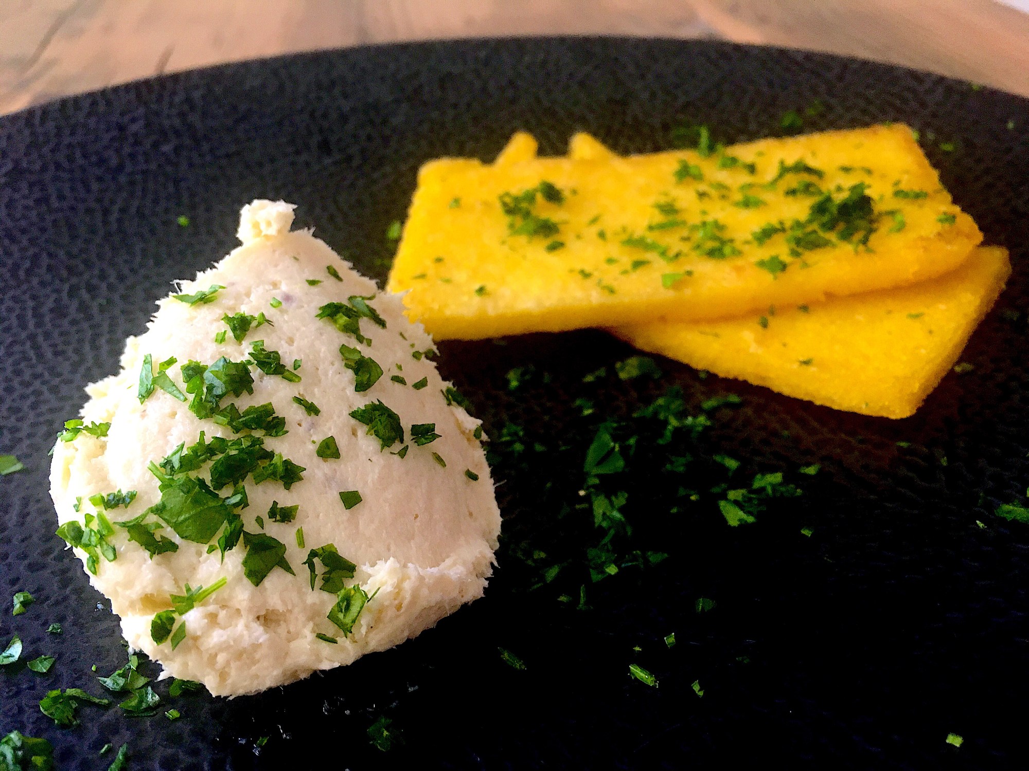 Salt cod, also known as bacalao (Spanish), bacalhau (Portuguese) or baccalà (Italian), is spread throughout the Mediterranean and used in a variety of ways. A very distinct way of preparation is this Venetian dish for which the cod is processed – traditionally in a mortar – with olive oil and served on a piece of toasted polenta. It comes out fluffy and light and makes an excellent starter / tapas or main.