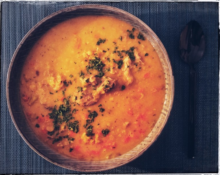 Anyway, having said enough about the outdoor conditions and ensuing state of mind, it should be rather obvious why I am posting a hearty, rustic, soul-warming eintopf recipe here today. As winter hits us with yet another blast of hail and snow, it is time to drop the sophistication and let thick soups talk… to your winter-tired, shivering core, that is.