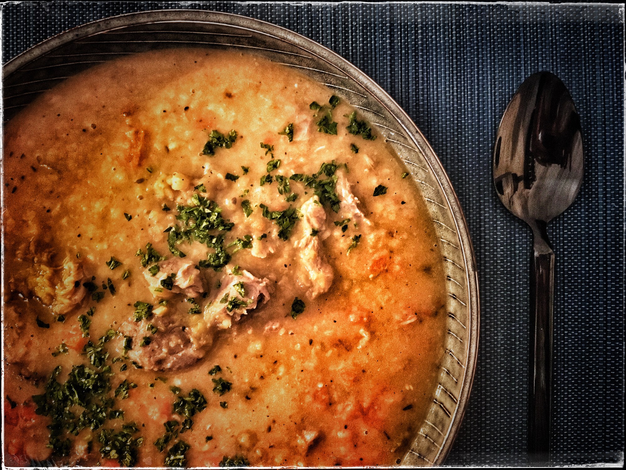 - Add the meat to the soup again and warm through properly before serving. Season with salt and freshly ground pepper to taste and decorate with a sprinkle of parsley. Enjoy the warmth! 🙂