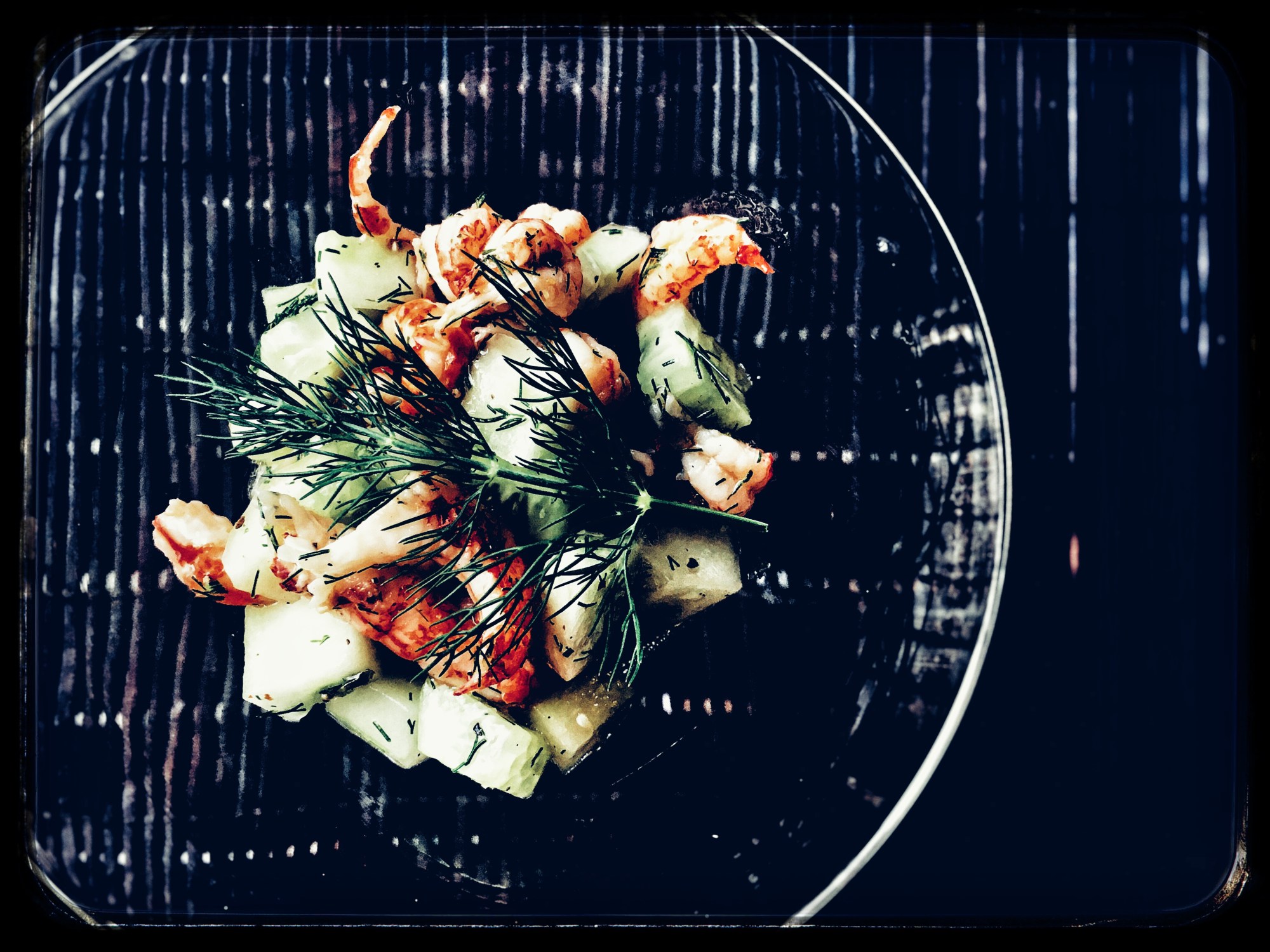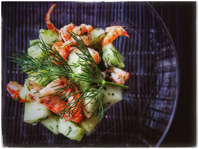- Add the chopped dill, the lemon juice and the olive oil to the cucumber and shrimp meat.
