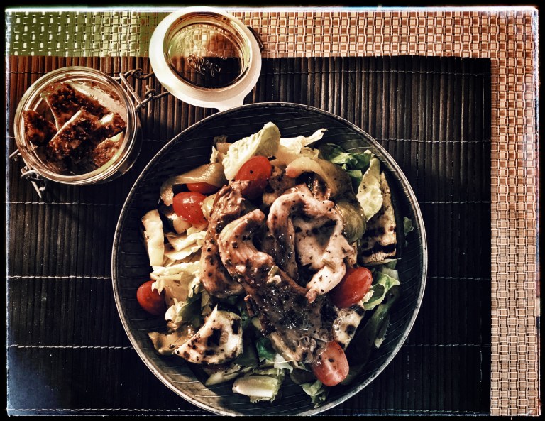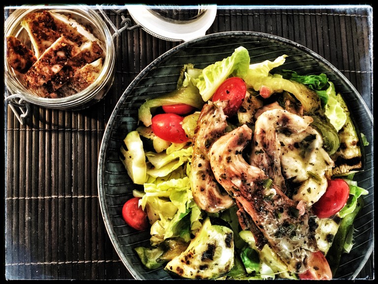 I recently prepared the chicken and had it with a side of salad topped with grilled vegetables, and I think it looked (and was!) so appetizing and tasty, and the combination went together really well. So I hope you will like it, too. – I think the best way to prepare the grilled vegetables, by the way, is on the barbecue. If you do not have a barbecue, you may as well prepare them in a grill pan, it will take a bit longer.