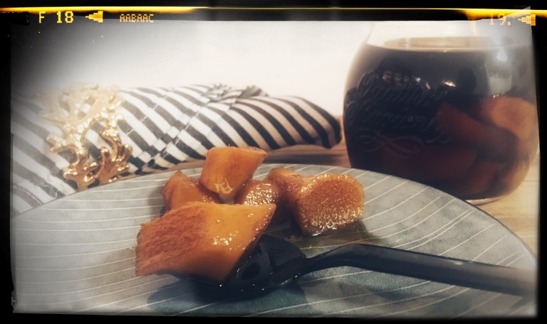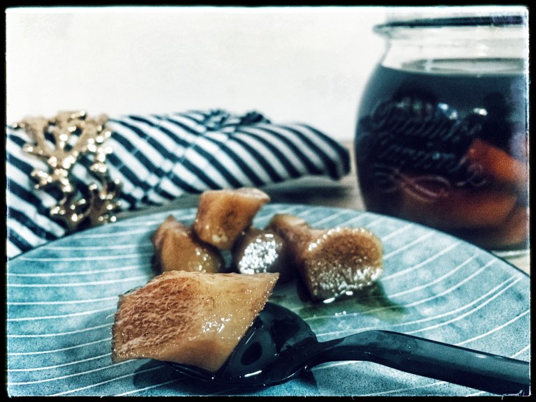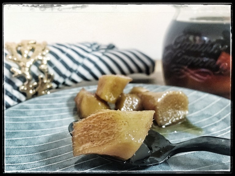 Christmas is the time of warm and intense spices, and ginger certainly ranks high amongst those spices that I particularly associate with the holiday season. In this recipe, it’s coming along as a preserve in a spiced syrup, combining more than one of those lovely earthy flavors of this time of the year.