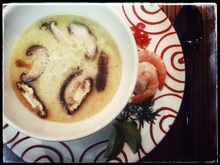 - Bring the soup to the boil. Add the prawns and boil for 30 minutes, then serve directly with wedges of lime, finely chopped fresh chili and fresh coriander for individual seasoning.