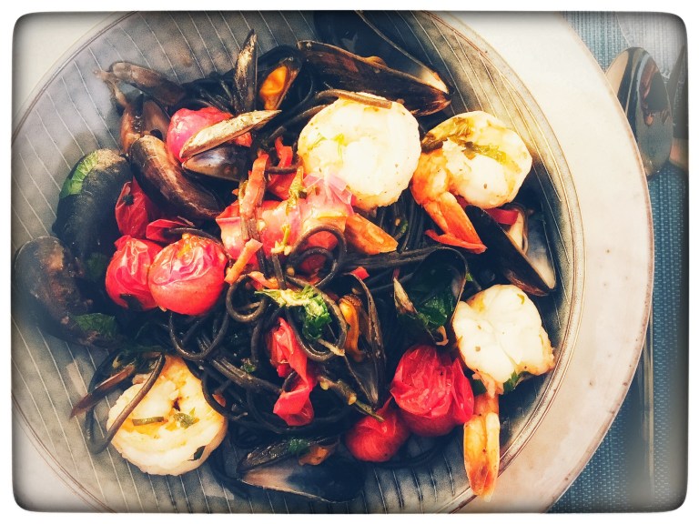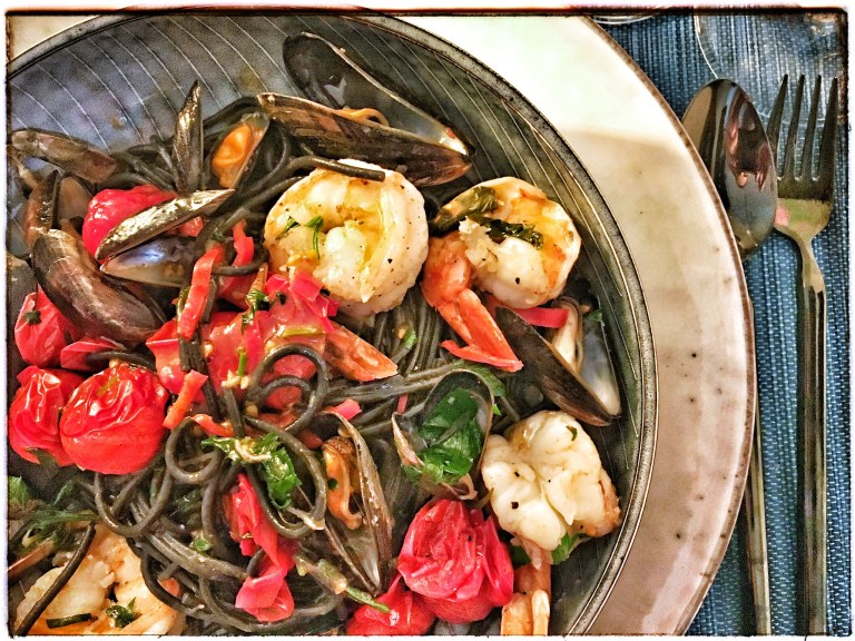 Shortly before the end of the mussel season, here’s a recipe for a luxurious seafood pasta dish bringing together Giant Tiger Prawns, blue mussels and sweet cherry tomatoes. Black spaghetti are the „obvious“ choice of pasta for this dish, both for their dramatic look and silky taste.