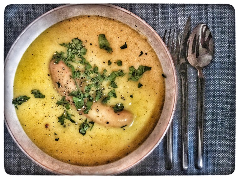 - Take off the heat, remove the herbs and set aside the sausages. Purée the soup until very smooth.