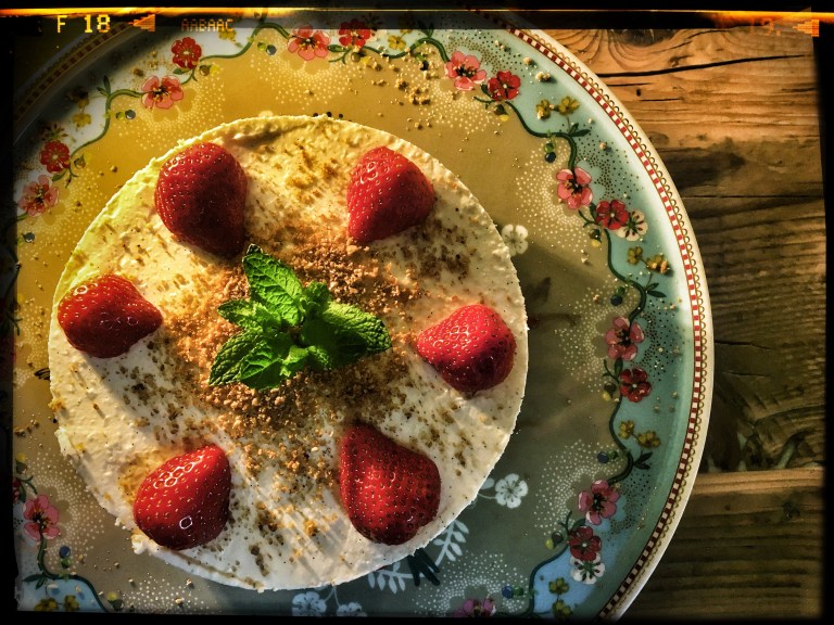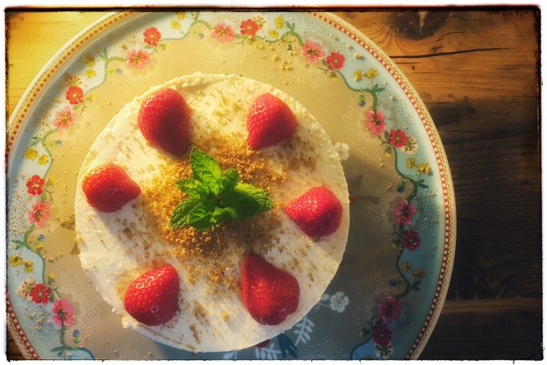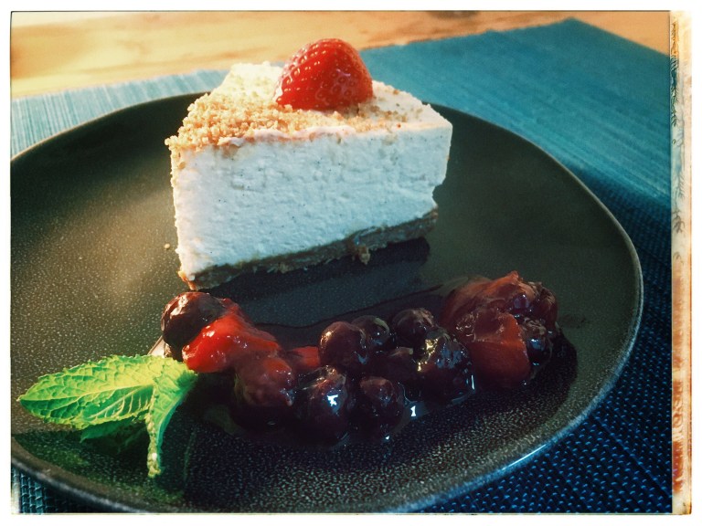- Sprinkle the cheesecake with the remaining granola crumbs and decorate with strawberry halves or blueberries and some mint leaves.