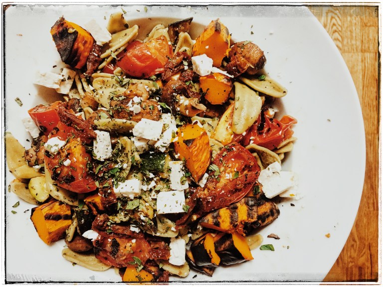 - Fire up the barbecue and roast the pumpkin, zucchini, tomato and mushrooms until nicely colored.