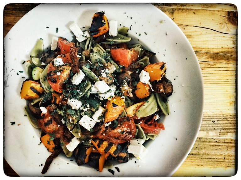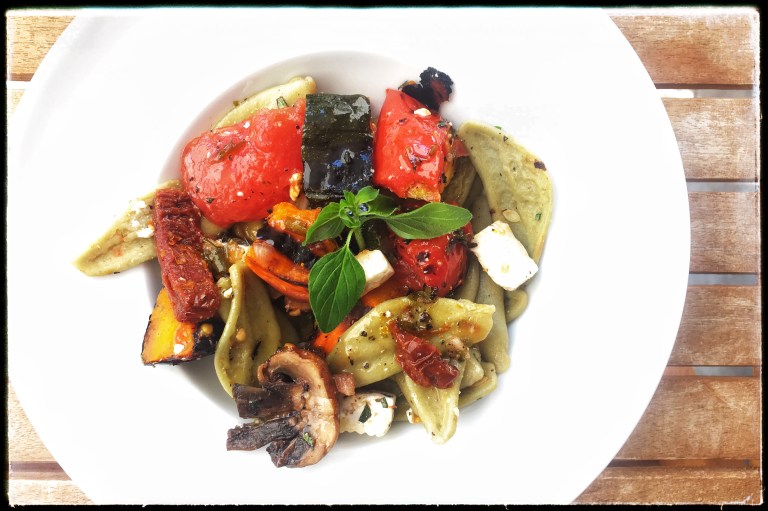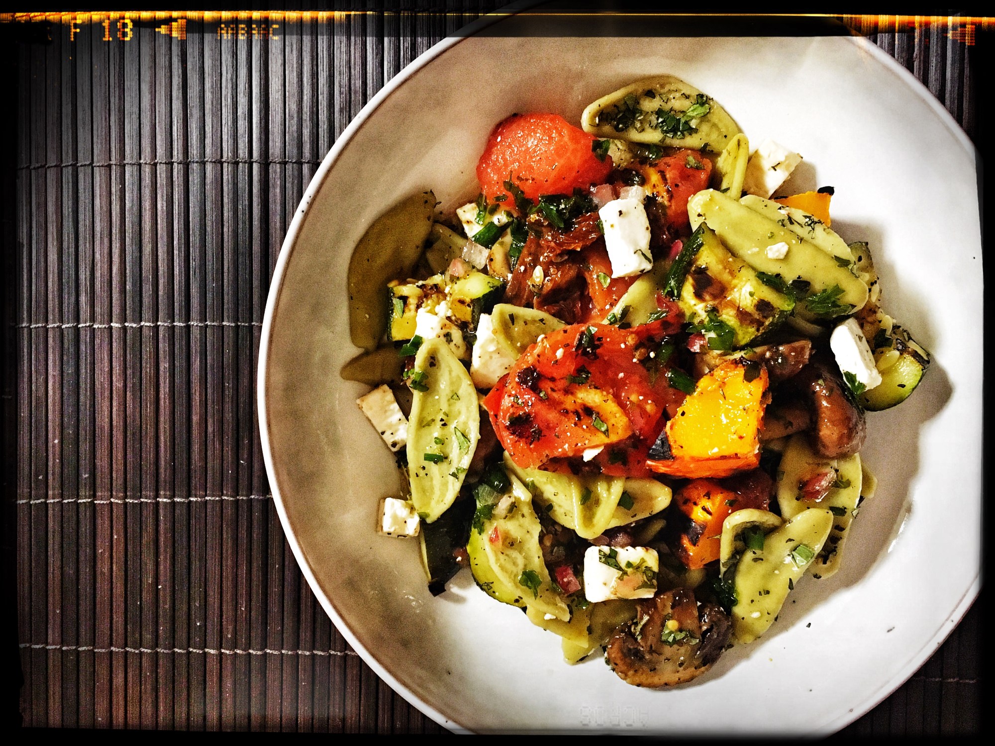 This cold pasta dish is not only a delicious cooling summer dish, but also pure joy for the eyes! Surely, few things can be imagined that transport a more summery feeling than roasted vegetables of all colors, lovely green pasta, sun-dried tomatoes and tangy goat cheese.