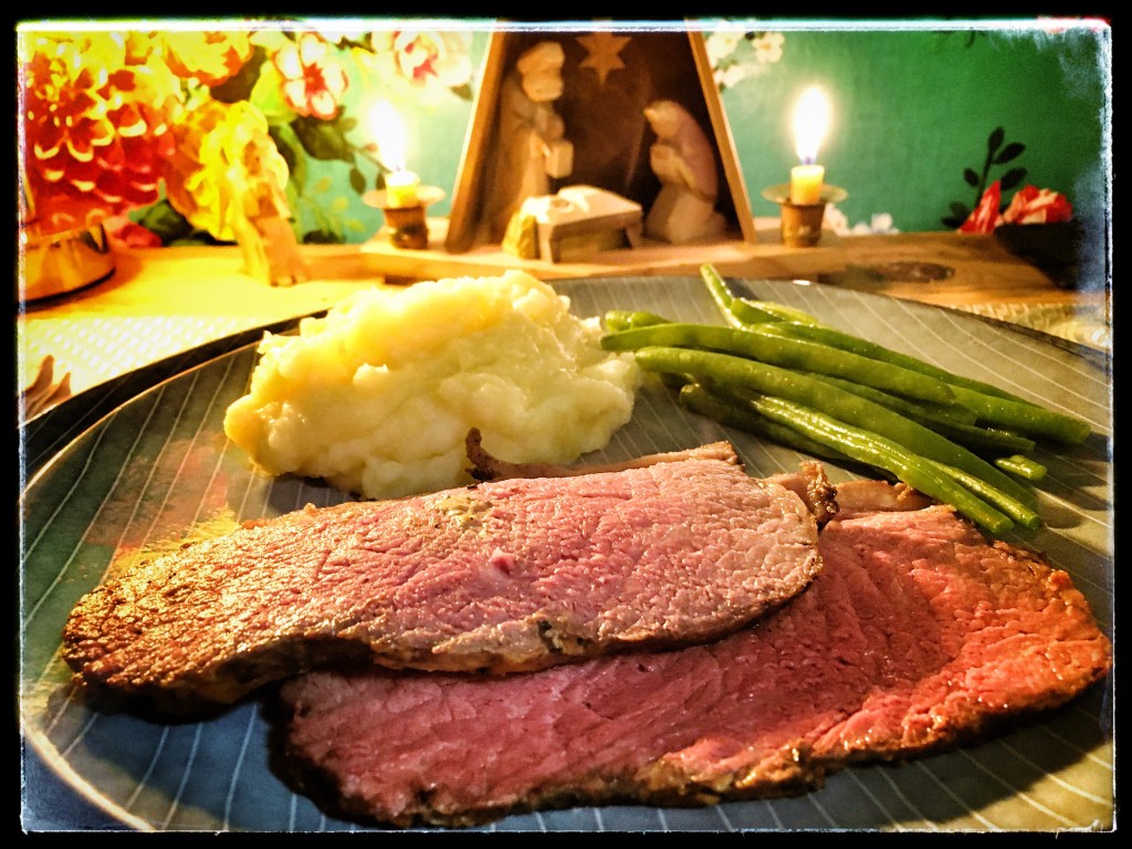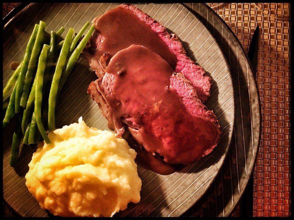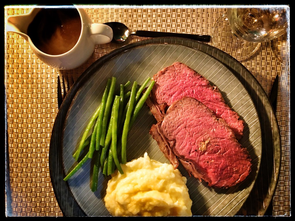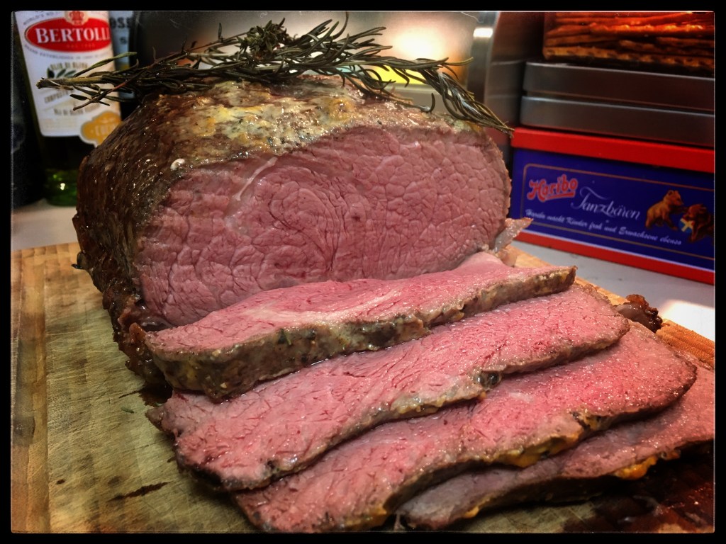 I love few things more than a really good roast-beef, but being a small household, I rarely cook one myself given that it requires a decently large piece of meat. – Last year’s Christmas, I however put this favorite dish of mine on the menu, counting on the following Christmas days to consume the leftovers in the form of cold meat dishes. I opted for a slow-roasting technique, as it just brings the best result if you like your roast beef really pink through and through.