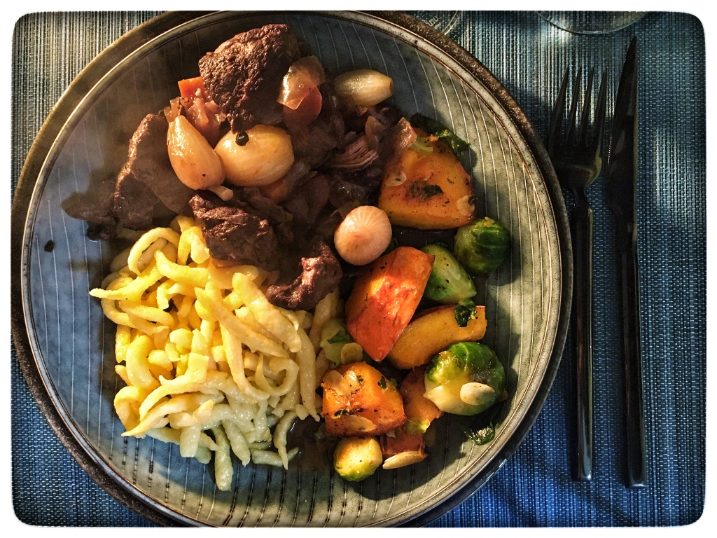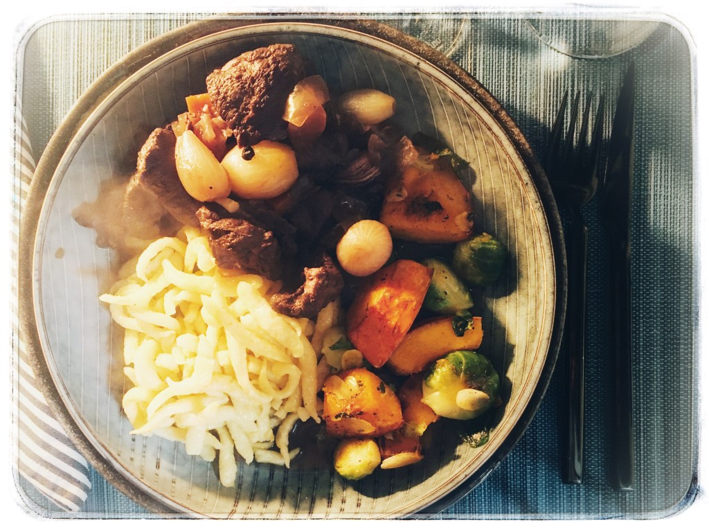 Sides that work well with the dish are spaetzle, boiled potatoes or potato dumplings and red cabbage, Brussel sprouts, carrots or green beans.