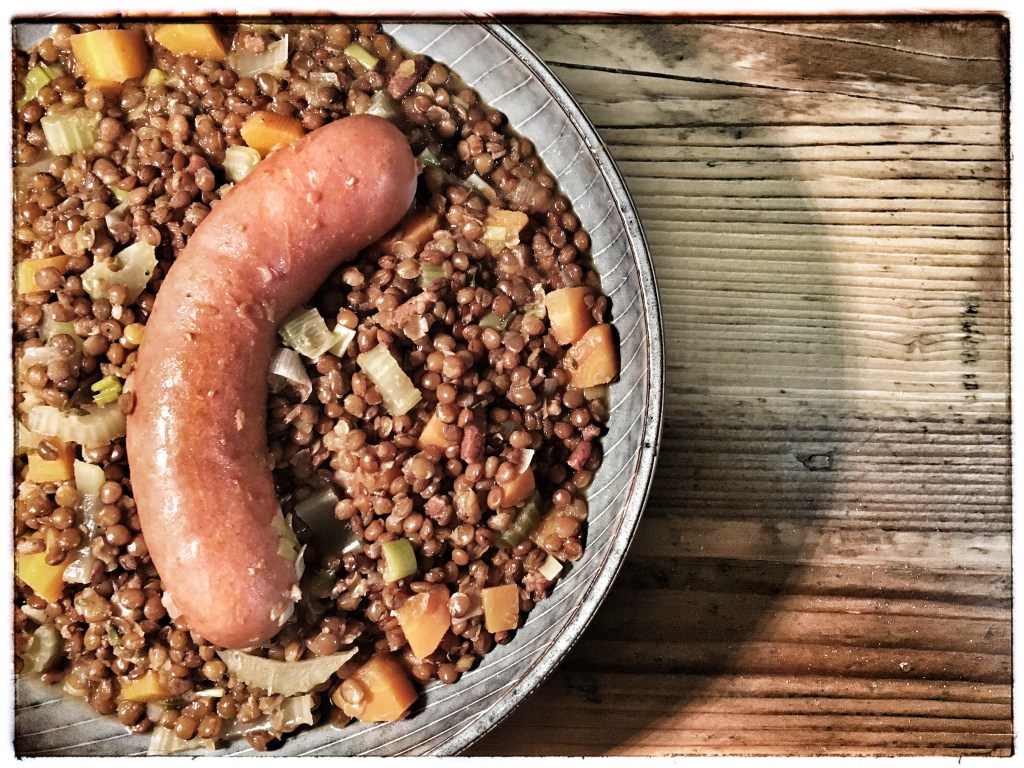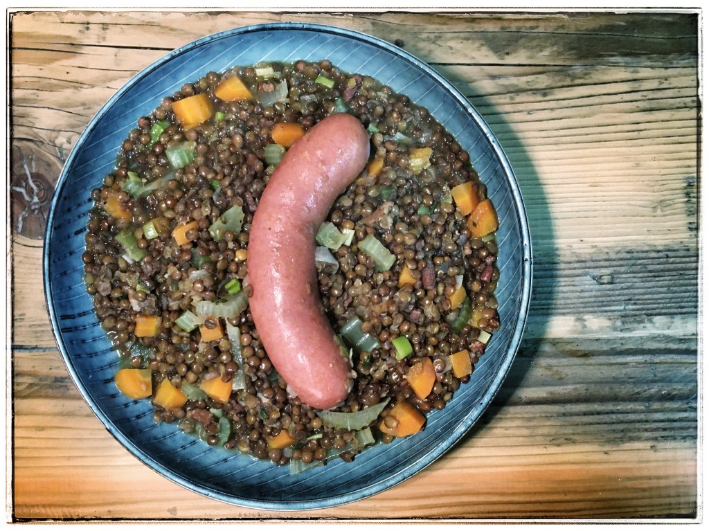 Lentil eintopf („one-pot“) is one of the most classic German eintopf recipes. I quite simply grew up with it, it being readily available at so many opportunities. My mother would put the dish on the table frequently enough, more often than not bought ready-to-serve at the local butcher, and I remember that my father loved it expecially. When I was a student, the Bonn mensa (student canteen) had one of three floors entirely dedicated to serving eintopf to hungry students. Every Friday, I would go with my girlfriend to have a big bowl of steaming stew, two skinny blonde girls lapping up what even through the most forgiving eyes can only be described as portions of shapeless brown-to-greyish-green-looking mush. And while she occasionally fancied the rice pudding and I the pea eintopf, we would even more often agree to go for the lentil eintopf. When I was a young professional, I would often spend lunches with my colleagues alternating between different international cuisines and yet – once a week we all went to the market which then had an eintopf stand, and we would have a serving of the thick stew which in the uncomfortable weather dominating German spring, fall and winter would always feels like a warm hug from within. Every today, I still jump on my bike in my lunch breaks every now and then to go to one of the Berlin markets that has an eintopf stand just like the one I frequented with my colleagues in the past to consume a bowl of the somewhat odd-looking dish. Eintopf in general and lentil eintopf in particular for me is a trip down memory lane, a link between old and new culinary experiences as that one dish with which you refuel before you are ready to go exploring again.