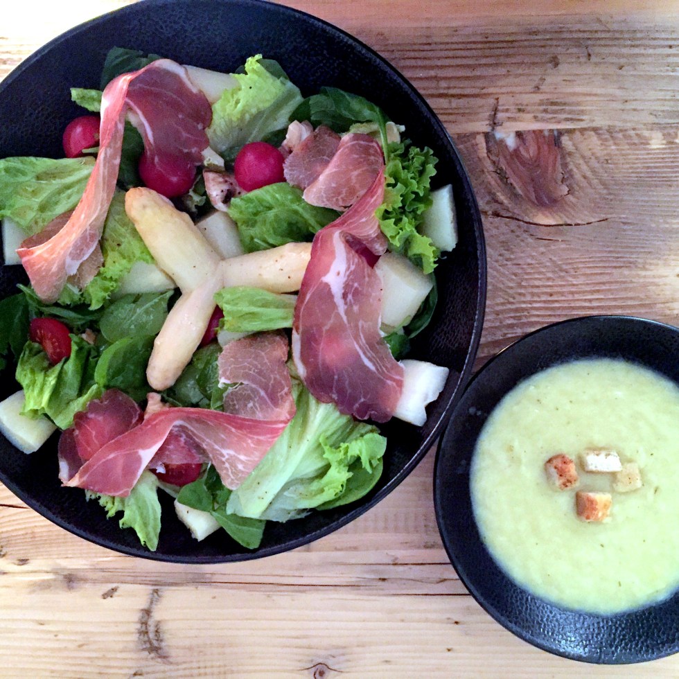 Potato Leek Soup & Green Salad with White Aspargus and Cured Ham