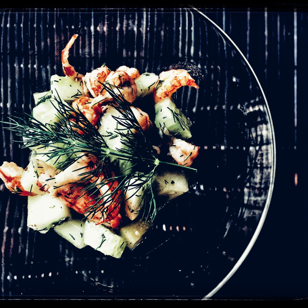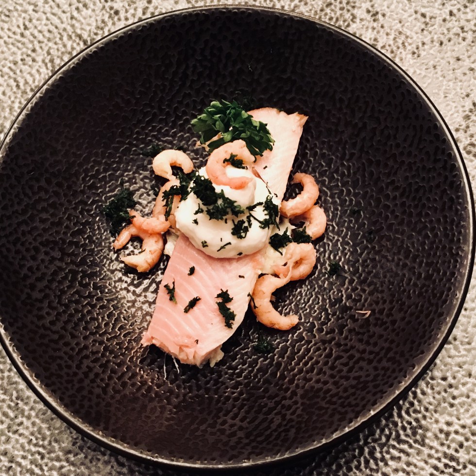 Amuse Bouche: Smoked Trout on Pumpernickel with Horseradish Cream and North Sea Shrimps